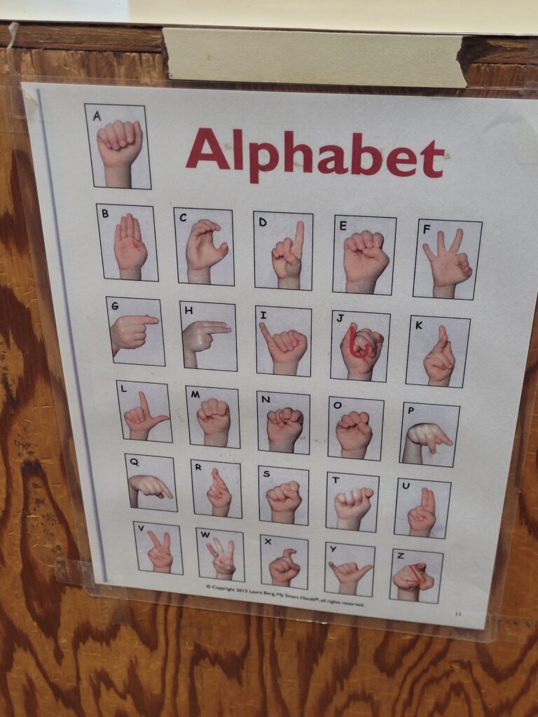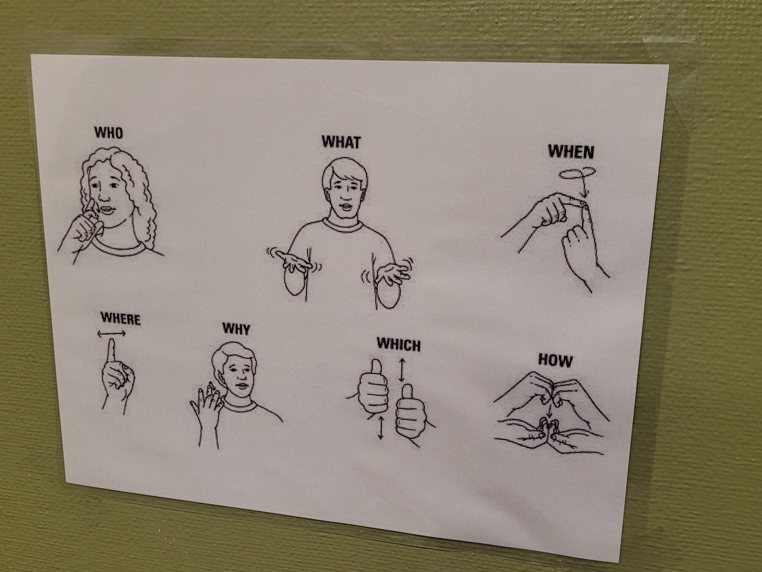 In our classroom, we use sign language to communicate with K. K touches the faces of the other children to get their attention, but some of them don’t like it. To help them communicate better, the mentor educator has taught them some basic signs such as ‘stop’, ‘no’, ‘mother’, ‘father’, ‘grandfather’, and ‘grandmother’. One day, during lunchtime, they were practicing these words. The sign language alphabet and question words are posted on the wall, and the children are curious about them. They often try to practice using them.“Children use multiple modes of expressive languages to communicate ideas, participate in relationships, and make meaning in their homes and communities” (Early Learning Framework, p.66).